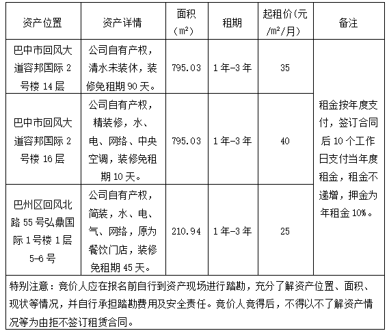 根據(jù)國有資產(chǎn)管理相關(guān)規(guī)定,巴中自然資源投資集團有限公司決定對相關(guān)資產(chǎn)進行公開招租?,F(xiàn)將有關(guān)事項公告如下: